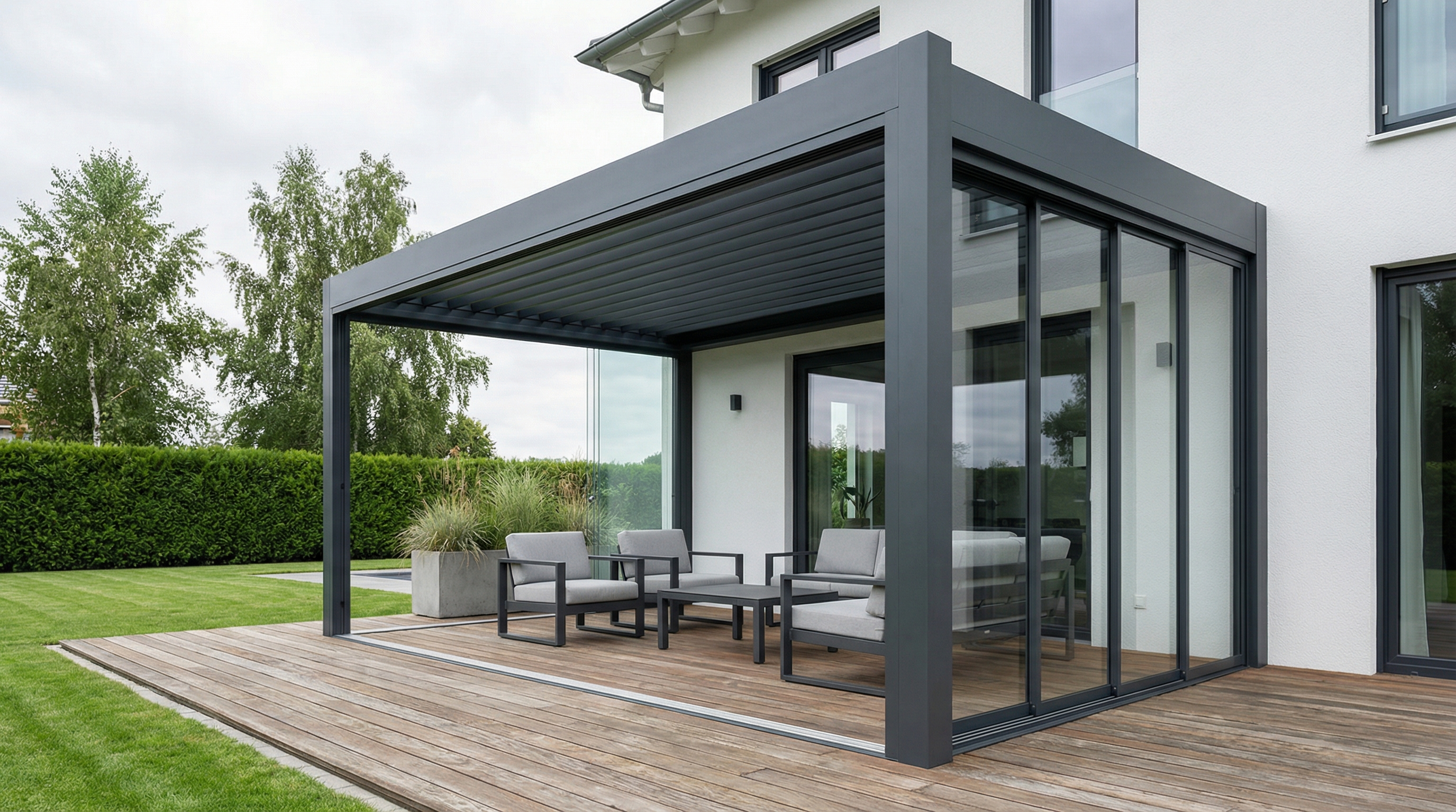 Für ein maßgefertigtes Aluminium-Terrassendach mit Sicherheitsglas. Der finale Preis richtet sich nach Größe, Ausstattung und Extras.